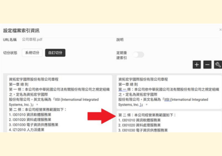 將企業或組織的專有文本資料分割成小單位,然後轉換成一串數字也就是向量(這個過程稱為嵌入),成為有語言意涵的資訊,最後存到資料庫,以供後面使用。