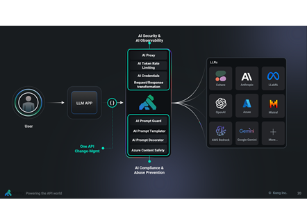 Kong Gateway是雲原生、高擴充性的API管理解決方案,提供認證、流量控管、資料轉換、APIOps、宣告式配置與CI/CD自動化治理,可跨環境集中管理與整合監控工具,並加強AI Gateway功能成為企業級AI存取與治理中樞,支援多家LLM集中管理、金鑰控管、智慧路由、模型快取與Token限制,並具備Prompt Guard、資料淨化與內容審查等能力,提升成本效益並確保AI流量安全合規。